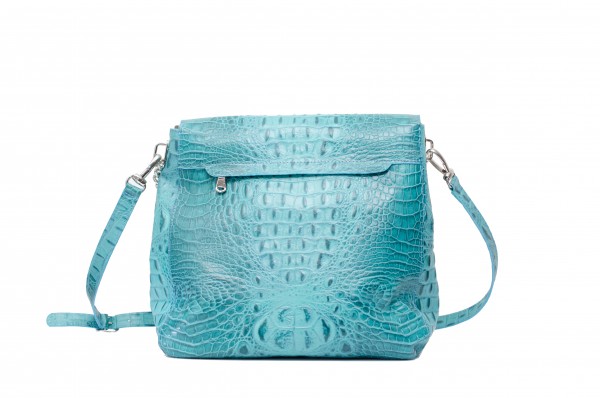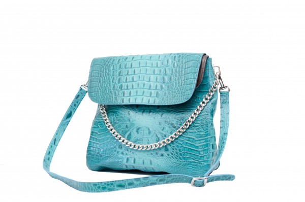 Poseta din piele naturala Culori disponibile: grey, turquise Dimensiuni Buzunare interioare, 3 compartimente Buzunar exterior cu fermoar, pe spate Maner lung detasabil, reglabil, lant decorativ